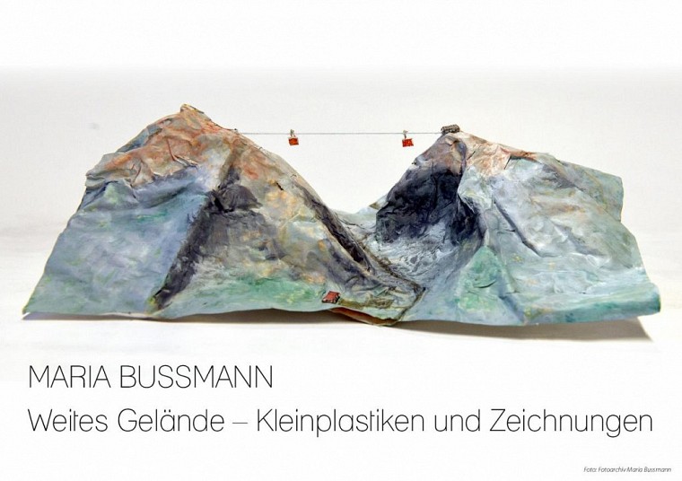 Maria Bussmanns Kleinplastiken sind voll Poesie und philosophischer Analyse. So einfach die verwendeten Materialien sind, so präzise sind ihre Aussagen. Die Kleinskulpturen aus Fundstücken, Farben, Papier, Draht und Klebstoff wirken wie Aquarelle, die sich in die Dreidimensionalität erhoben haben. Sie erzählen vom weiten Gelände und zeigen ausschnitthaft Gebirgsbäche, Skipisten, Wasserfälle, Seilbahnen, Schwimmbecken oder Vulkanausbrüche. In der Ausstellung treffen die fragilen Kleinobjekte auf großformatige Graphitzeichnungen von fernen Küstenstrichen und Felseninseln.