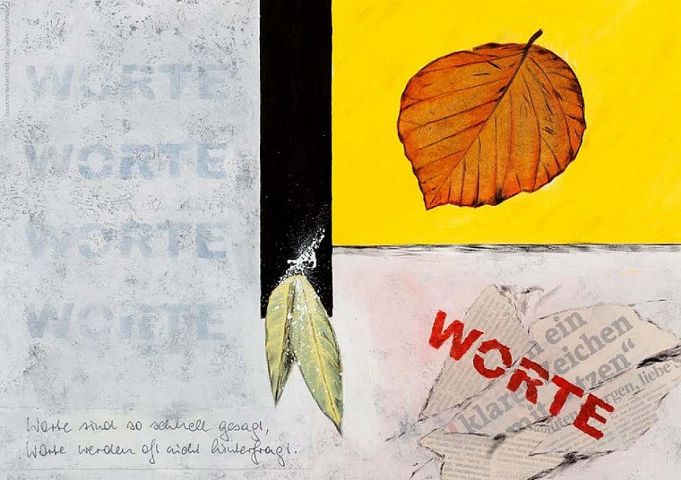 Auch einige frühe Arbeiten zu Textauszügen von Ingeborg Hanreich sind ausgestellt. Straßls Bilder zu Textzeilen von Maria Anna Andetsberger sind 2015 in dem Gedichtband Gemeinsam im Wiener Verlag Ingeborg Hanreich und 2020 im Bildkalender Mit Gedanken & Pinselstrichen erschienen – beide Drucksorten liegen auf.