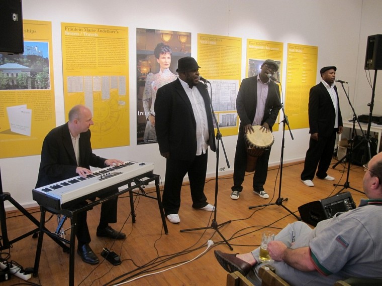 Ein Publikumsmagnet waren auch MoZuluArt, die die Eröffnung musikalisch bereicherten. Die drei A-Capella Sänger Vusa Mkhaya Ndlovu, Blessings Zibusiso Nqo Nkomo und Dumisani Ramadu Moyo aus Simbabwe sowie der Tastenvirtuose Roland Guggenbichler aus Braunau begeisterten mit ihren genialen Kompositionen, die klassische Klaviermusik wie Mozarts Kleine Nachtmusik mühelos mit Zulu Vokaltraditionen verbinden. Am Ende ihrer konzertanten Darbietung gab es kein Halten mehr. Der ganze Saal tanzte zu den afrikanischen Rhythmen und genoss ausgelassen den gelungenen Abend, der erfolgreich Heimat und Ferne verband.