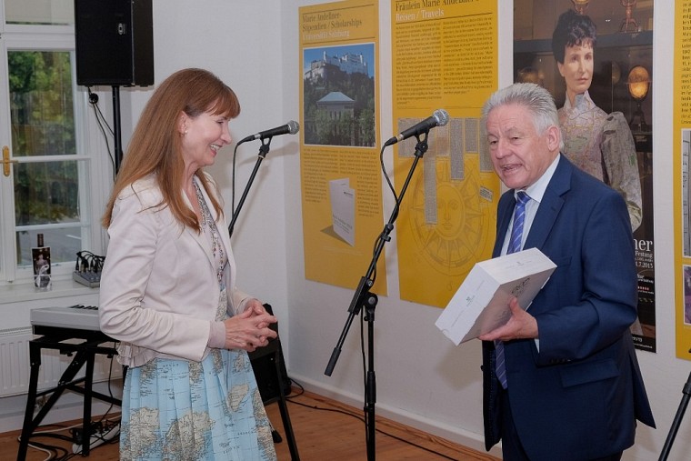 Großer Andrang herrschte am Samstag 2. Juli im Kulturhaus Stelzhamermuseum Pramet als Dr. Josef Pühringer auf Einladung von Altbürgermeister und Obmann Josef Hörmanndinger die Ausstellung „Ein Fest für Marie Andeßner, Weltreisende aus Eberschwang und andere weit gereiste Frauen“ eröffnete. Der Landeshauptmann überreichte der mit oberösterreichischen Wurzeln in Salzburg und Wien lebenden Künstlerin Irene Andessner Gmundner Keramik, um daraus fortan „ihren kleinen Schwarzen“ (O-Ton LH) trinken zu können.