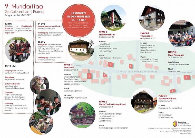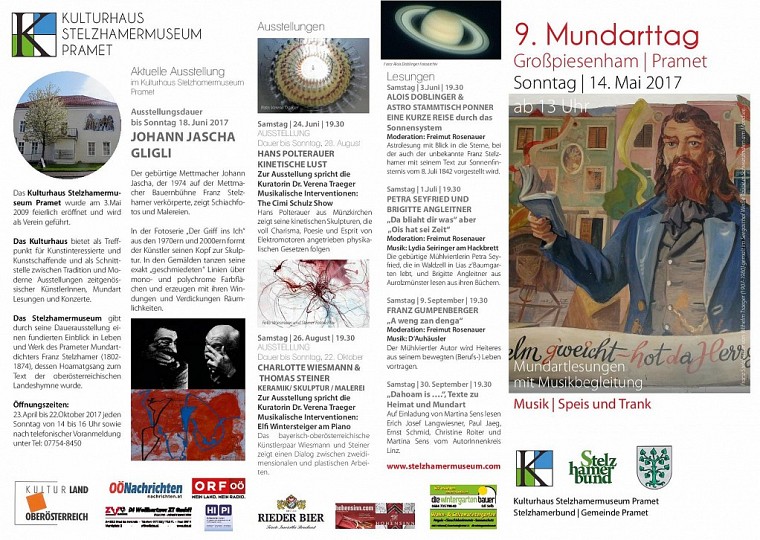 Zum 9. Mal luden das Kulturhaus Stelzhamermuseum Pramet, der Stelzhamerbund und die Gemeinde Pramet zum Mundarttag nach Großpiesenham. Das großartige Fest der Mundart, das alle zwei Jahre stattfindet, wurde in diesem Jahr am Muttertag Sonntag 14.Mai 2017 gefeiert. Die Organisation hatte Altbürgermeister Josef Hörmandinger übernommen.