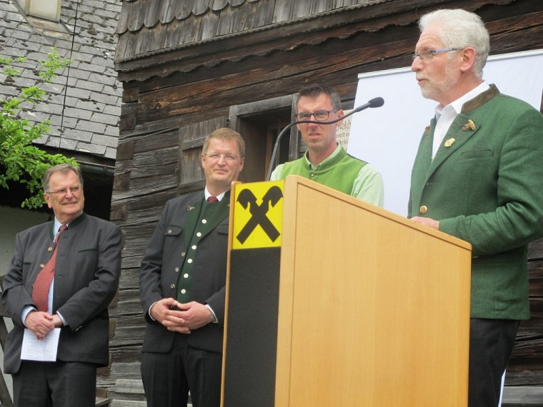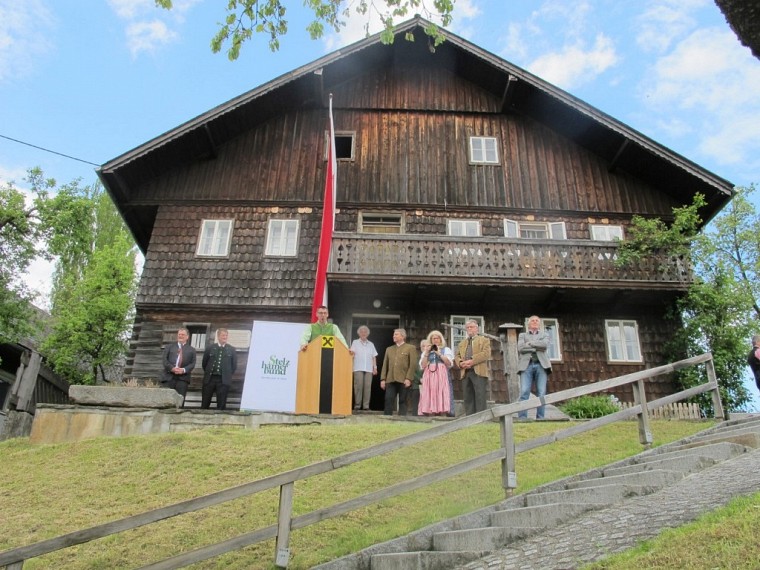 Der stimmungsvolle Nachmittag begann um 13h mit der Aufstellung der Musikkapelle Pramet und dem von ihr angeführten Einzug ins Dichterdorf. Schon vor dem Einmarsch wurden die Ehrengäste von der Familie Rohrbauer mit Hochprozentigem versorgt. Vor dem Stelzhamerhaus fand wieder das Festprogramm statt. Nach der Begrüßung durch Bürgermeister Eduard Seib, der sich bei allen Mitwirkenden aufs Herzlichste bedankte, und den einführenden Worten des Präsidenten des OÖ Forums für Volkskultur Konsulent Herbert Scheiböck und des Präsidenten des Stelzhamerbundes Mag. Klaus Huber hielt Karl Pumberger-Kasper eine Laudatio auf den anwesenden Mundartdichter Hans Hermandinger aus Waldzell. Ihm verlieh der Stelzhamerbund vor Ort das bronzene Ehrenzeichen für besondere Verdienste um den Stelzhamerbund und die Mundartdichtung in Oberösterreich. Nach der Rede des neuen Obmanns des Kulturhauses Stelzhamermuseum Pramet Hofrat Dr. Franz Pumberger, übernahm in Vertretung von Landeshauptman Mag. Thomas Stelzer Nationalrat Ing. Manfred Hofinger die eigentliche Eröffnung. Den feierlichen Abschluss bildete traditionsgemäß unsere oberösterreichische Landeshymne Hoamatland mit Franz Stelzhamers Text. Alle sangen die drei Strophen, die durch die Musikkapelle Pramet musikalisch begleitet wurden.