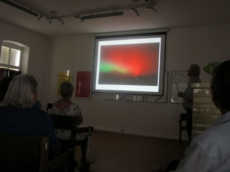 Danach entführte Alois Doblinger die Anwesenden mit seiner Powerpoint Präsentation in die Weiten des Weltalls. Er zeigte Satellitenfotos und eigene Aufnahmen aus unserem weitläufigen Sonnensystem, die der Hobbyastronom teils von seiner privaten Sternwarte aus in Hohenzell gemacht hat. Wir sahen verschiedenste Planeten sowie Sonne und Mond, Sonne und Mond Finsternis, Sonneneruptionen oder die roten Polarlichter über dem Innviertel. Kustos Rosenauer bedankte sich bei dem Vortragenden mit einer Magnum-Bierflasche (Die XXL Bierflasche wurde dankenswerterweise von der Rieder Brauerei gestiftet).