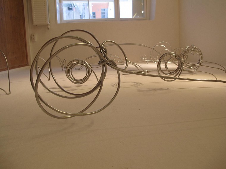 Charlotte Wiesmann (geb. 1961 in Grafenau im Bayerischen Wald), die ihre Lehre zur Keramikerin in Freising in Bayern und danach ihr Studium in der Keramikklasse von Günter Praschak (1940–2015), einem der wichtigsten Vertreter der modernen Keramik in Österreich, an der Hochschule für künstlerische und industrielle Gestaltung in Linz absolviert hat, erweitert mit ihren Arbeiten konstant die Grenzen als Keramikerin. Die Bandbreite ihrer künstlerischen Arbeiten reicht von Keramik und Skulptur, über Malerei und Zeichnung bis zu Fotografie und Video. Wiesmannexperimentiert auch mitunterschiedlichen Materialien wiebei den in Pramet gezeigten Skulpturen aus8mm rundem Aludraht, die ähnlich wie Elektrodrähte bei einer Baustellensituation aus der Wand in den Raum greifen und die grafischen Komponenten der Mischtechniken von Thomas Steiner aufgreifen.
