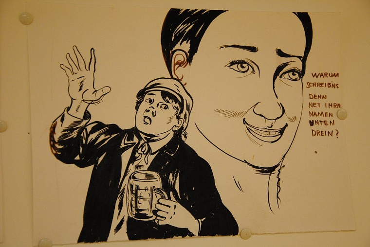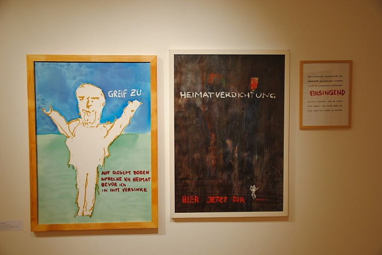 So zeigte sich Peter Assmann, Direktor der OÖ. Landesmuseen, in Pramet mit einer dreiteiligen Wandinstallation selbst als Kunstschaffender. Die Autorin Eva Fischer präsentierte Antworten auf die Frage „Wie schmeckt das Hoamatland?“ und wollte das auch von den Ausstellungsbesuchern wissen. Bezug auf das „Hoamatland“ nahm auch Elke Sackel in ihrem Beitrag: 13 „Himmel-und-Hölle“-Spiele, gefaltet aus den Seiten eines Asylantrags. Fotokünstlerin Edith Maul-Röder porträtierte 20 Welser Volksschulkinder beim Erlernen der oberösterreichischen Landeshymne - die Hälfte davon spricht nicht Deutsch als Muttersprache. Die Innviertler Landschaft betraf ein Bild von Karl Grausgruber, ein gesticktes Textbild steuerte Ingrid Wurzinger zu der Schau bei. Christoph Raffetseder und Herbert Christian Stöger ließen in einem Comic und einer Video-Animation Franz Stelzhamer, Adalbert Stifter und Peter Rosegger nach einer Lesung in einem Innviertler Wirtshaus zusammentreffen - auf der Flucht vor Geldeintreibern. Auch Dietmar Brehm, Karl Ellinger und Paul Jaeg zeigten im Kulturhaus die Resultate ihrer Beschäftigung mit dem bedeutendsten Mundartdichter des süddeutschen Sprachraums.