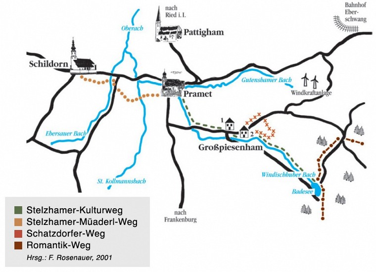 Der Franz-Stelzhamer-Kulturweg, eröffnet 1996, führt von Pramet auf einer schmalen Dorfstraße nach Großpiesenham, einer Ortschaft, in der man noch typische Innviertler Holzhäusern vorfindet. Eine Besichtigung des Stelzhamerhauses ist empfehlenswert. Sehenswert ist auch das gegenüberliegende „Tischlerbauernhäusl“ aus dem 17. Jhd. mit seinem reichhaltigen Inventar (bei Familie Flachs im Neubau läuten). Der Weg führt - vorbei am Schatzdorferhaus und einer ehemaligen Mühle – hinab in eine Wiesensenke, begleitet das Bacherl am Talgrund bis zum Endpunkt, dem Gasthaus Seeklause. Gehzeit: 1 Stunde